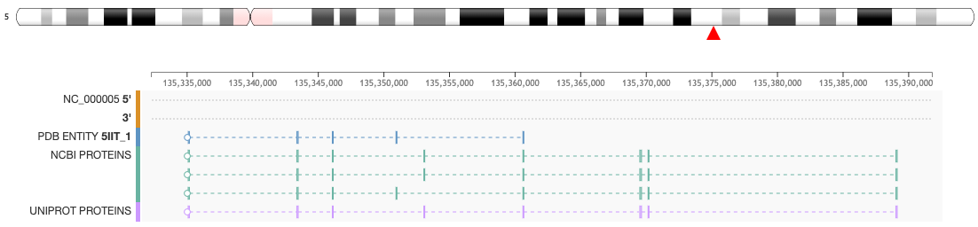 - In order to explore the protein-genome mapping click on the Genome Tab of the Structure Summary Page (e.g. 5IIT)
