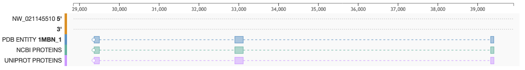 - To see the mapping between proteins and genes: Blocks display the position of PDB Entities (Blue), NCBI proteins (Green) and UniProt proteins (purple)