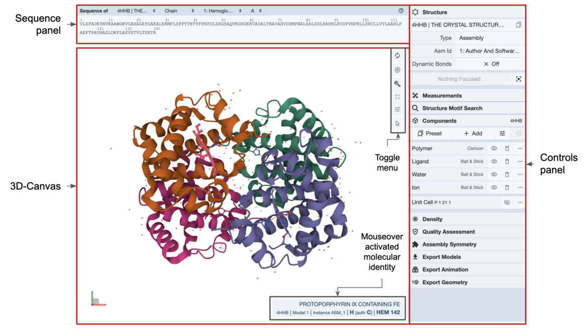 Sequence Panel: This menu displays the polymer sequences of macromolecules (proteins and nucleic acids) present in the uploaded PDB structures. In addition, it provides quick access to any small molecular ligands or entities present in the structure(s). It is located at the top of the screen above the 3D Canvas.